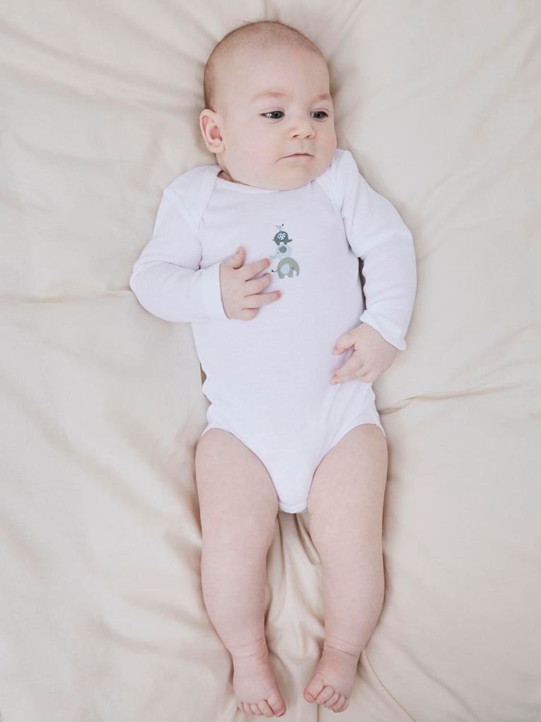 • Bio-Baumwollbodys, kinderleicht anzuziehen dank amerikanischem Ausschnitt, ideal für neugeborene Jungen.