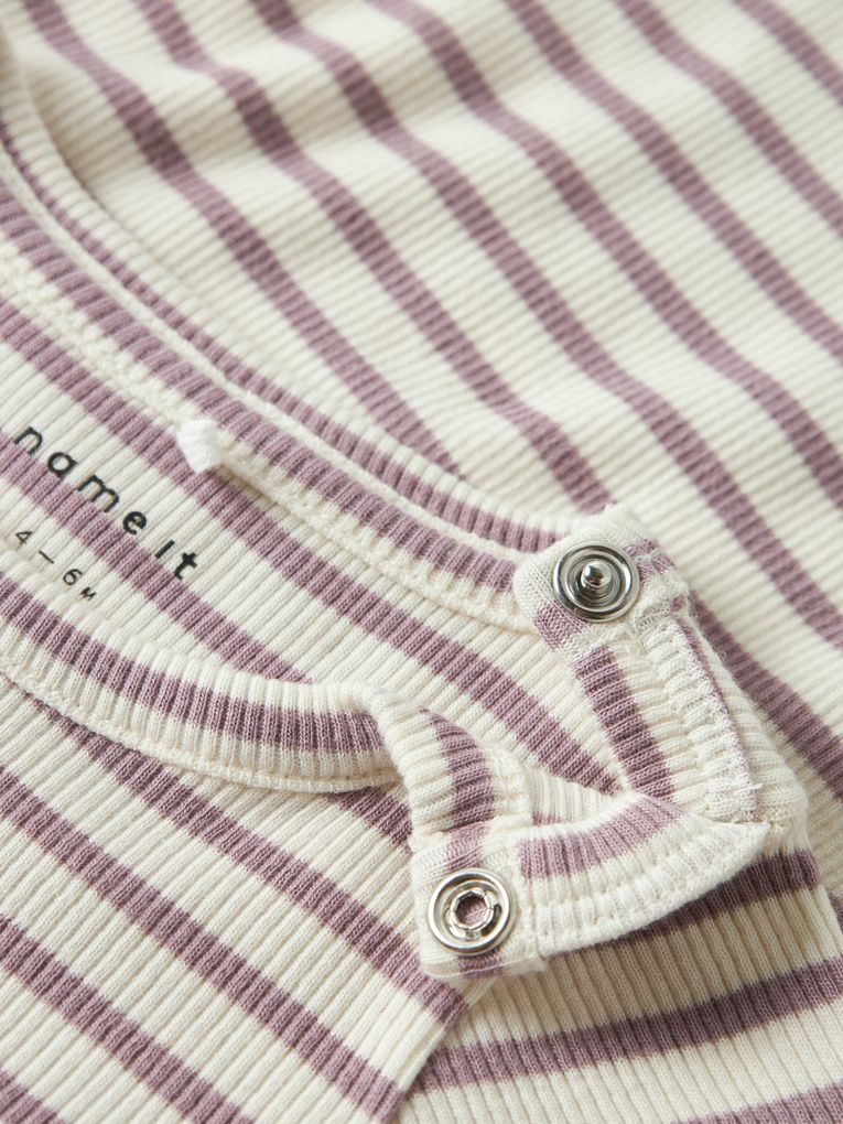 Der gerippte Strick mit dem dezenten Längsstreifenmuster verleiht dem Langarmbody einen zeitlosen Charakter, während der praktische Druckknopfverschluss das An- und Ausziehen erleichtert. Das schlichte Rundhalsausschnitt-Design macht diesen Body vielseitig kombinierbar.