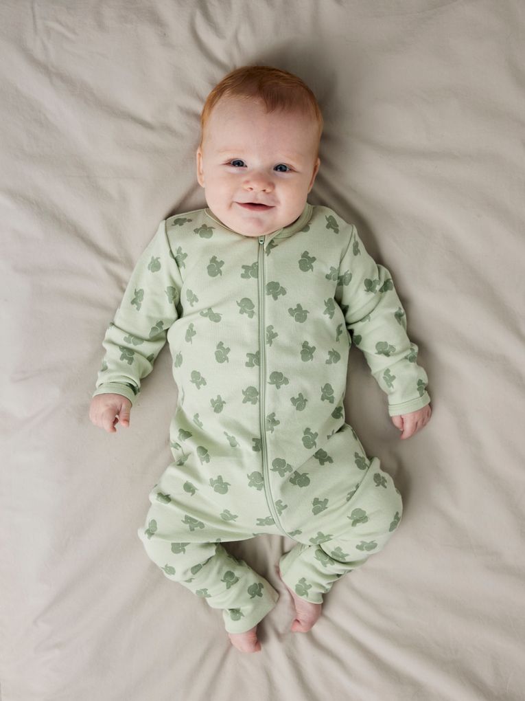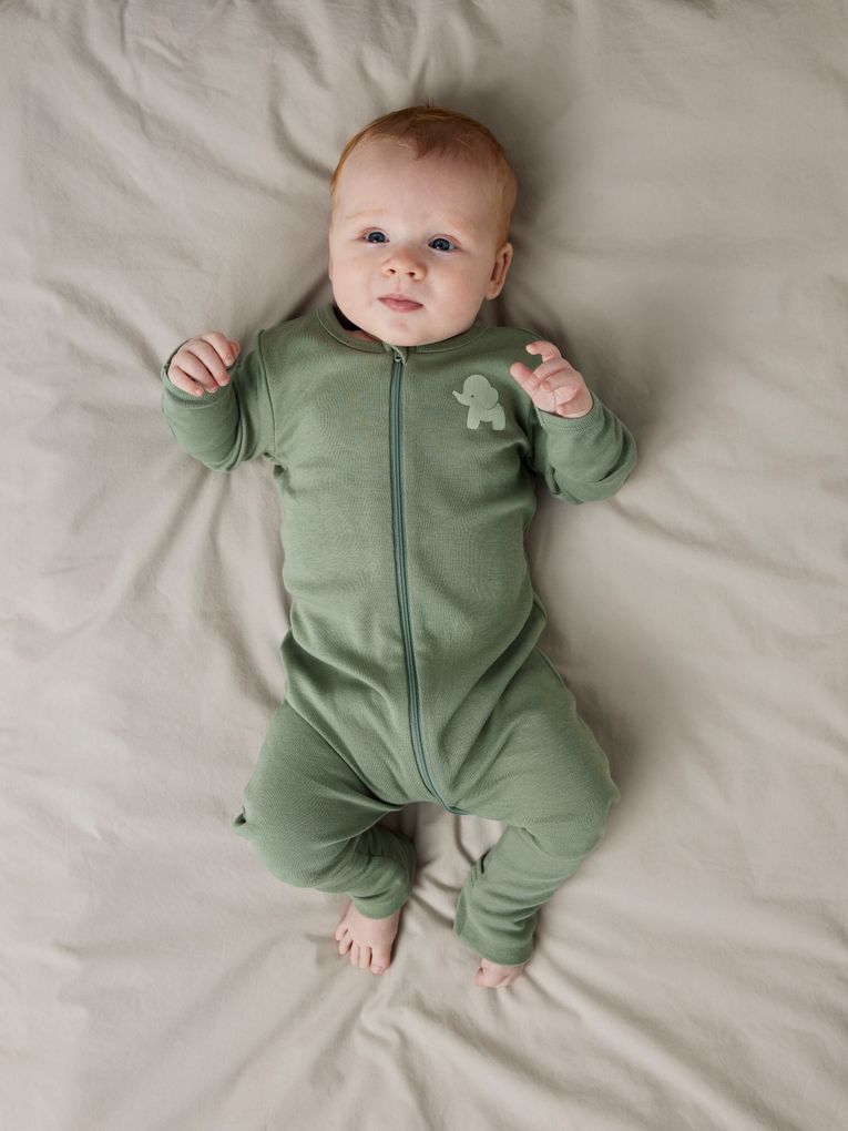 Die Schlafstrampler kommen in zwei liebevoll gestalteten Varianten: Ein Strampler in sanftem Grün mit einem subtilen Elefanten-Print und ein weiterer in einheitlichem Grün mit einem süßen Elefanten-Patch. Beide Designs sind mit praktischen Reißverschlüssen ausgestattet, die das An- und Ausziehen erleichtern – ideal für schnelle Windelwechsel mitten in der Nacht.