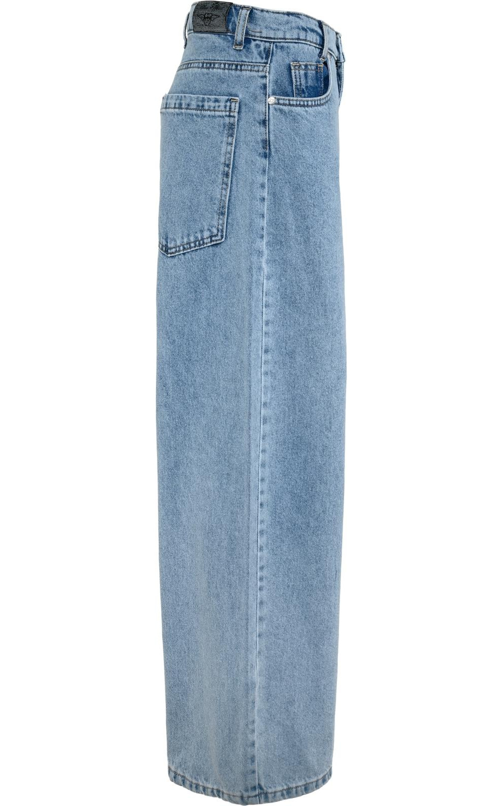 Der Bund ist bewusst extra schmal geschnitten und sorgt dafür, dass die Jeans auch bei zierlichen Kindern sicher sitzt. Zusätzlich lässt er sich innen individuell anpassen, sodass nichts rutscht oder drückt. Trotz des schmalen Bundes bleibt der Look lässig, denn ab der Hüfte entfalten sich die weit geschnittenen Hosenbeine im typischen Baggy-Stil.