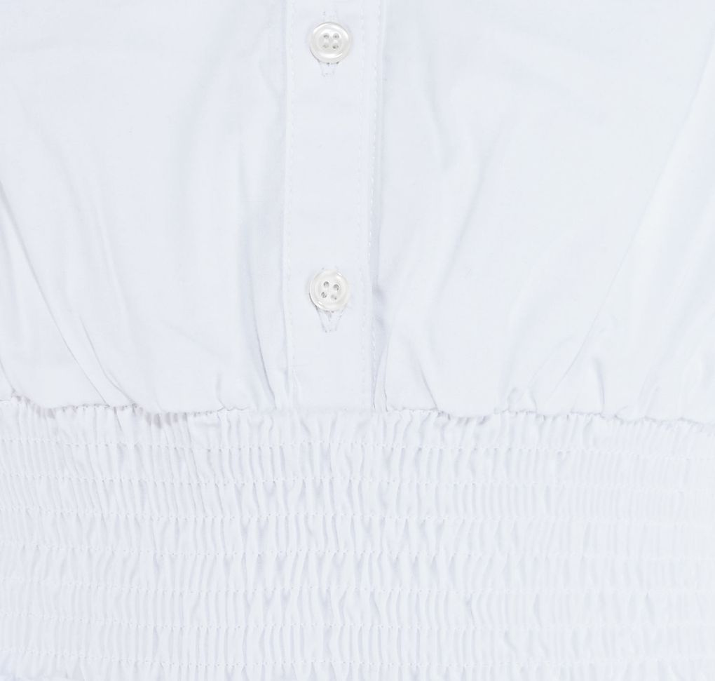 • Besonderheiten: Knopfleiste, Kragen, lange Ärmel, kurze Form, gesmokter Taillenbereich