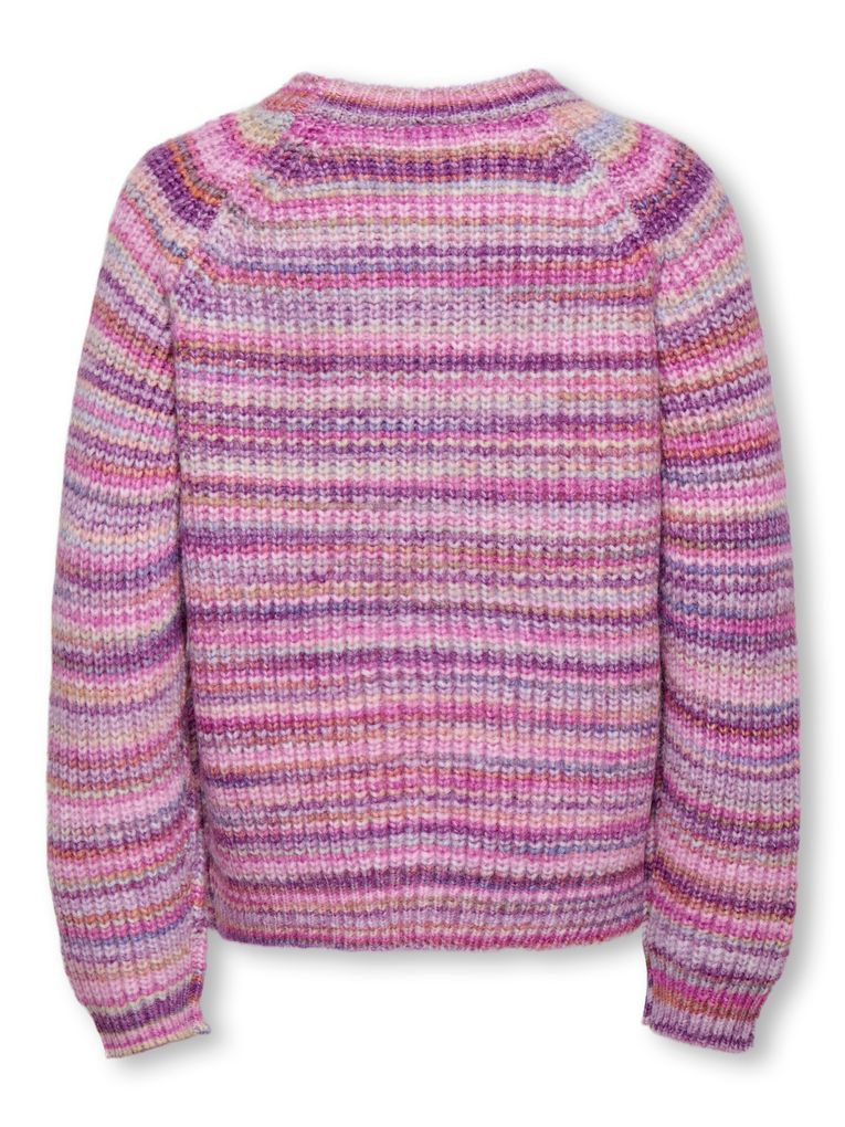 Dieser Strickpullover von Kids Only begeistert mit seinem melierten Multicolor-Look in harmonischen Rosé- und Lilatönen. Das dezente Streifenmuster entsteht durch die strukturierte Rippenoptik und verleiht dem Design eine verspielte Dynamik. Ideal für Mädchen und Teenager, die Farbe lieben und auf bequeme Alltagsmode setzen.
