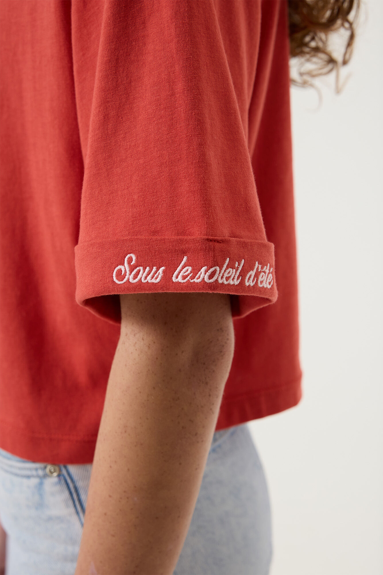 Der Stoff fühlt sich weich und angenehm auf der Haut an und bietet genug Bewegungsspielraum für aktive Tage. Das Shirt hat einen gerundeten Halsausschnitt, überschnittene Schultern und weite Ärmel mit Umschlag, die für ein entspanntes Sitzgefühl sorgen. Die etwas kürzere Länge unterstreicht den modernen, unkomplizierten Schnitt.