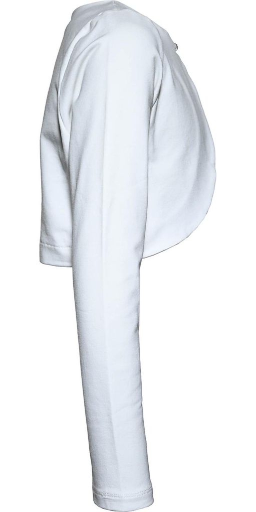 Die Bolerojacke verfügt über einen praktischen Knopfverschluss und lange Ärmel, die für einen eleganten Look sorgen. Mit ihrer kurzen Form lässt sie sich vielseitig kombinieren und ergänzt jedes festliche Outfit harmonisch. Die Jacke ist aus hochwertigem Baumwolljersey mit einem Elasthananteil gefertigt, was für eine bequeme Passform und Bewegungsfreiheit sorgt.