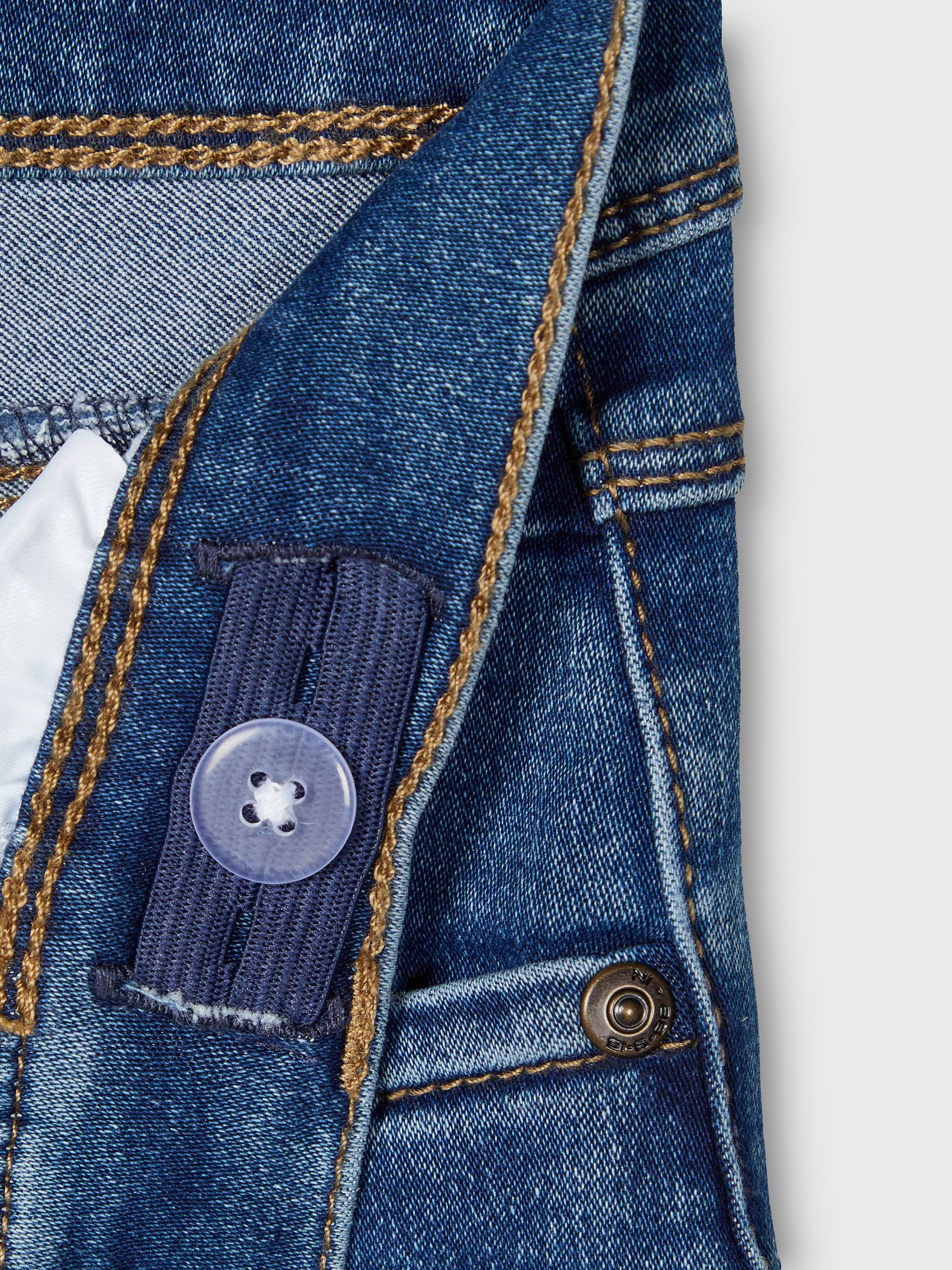 Der Hosenschlitz mit Haken- und Reißverschluss sorgt für einen sicheren und bequemen Sitz. Der verstellbare Bund passt sich an, während dein Kind wächst, und die Nieten an den Taschen geben der Jeans einen coolen Touch.